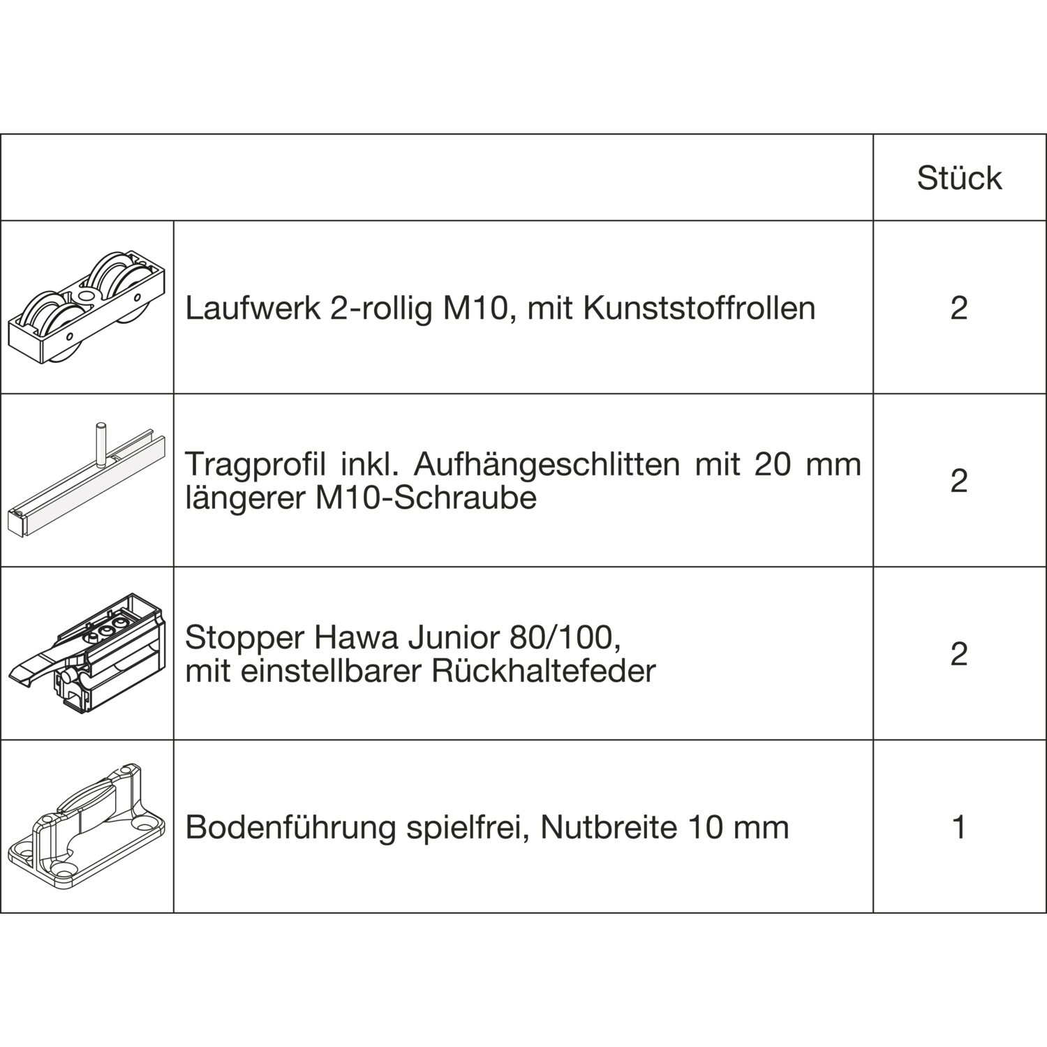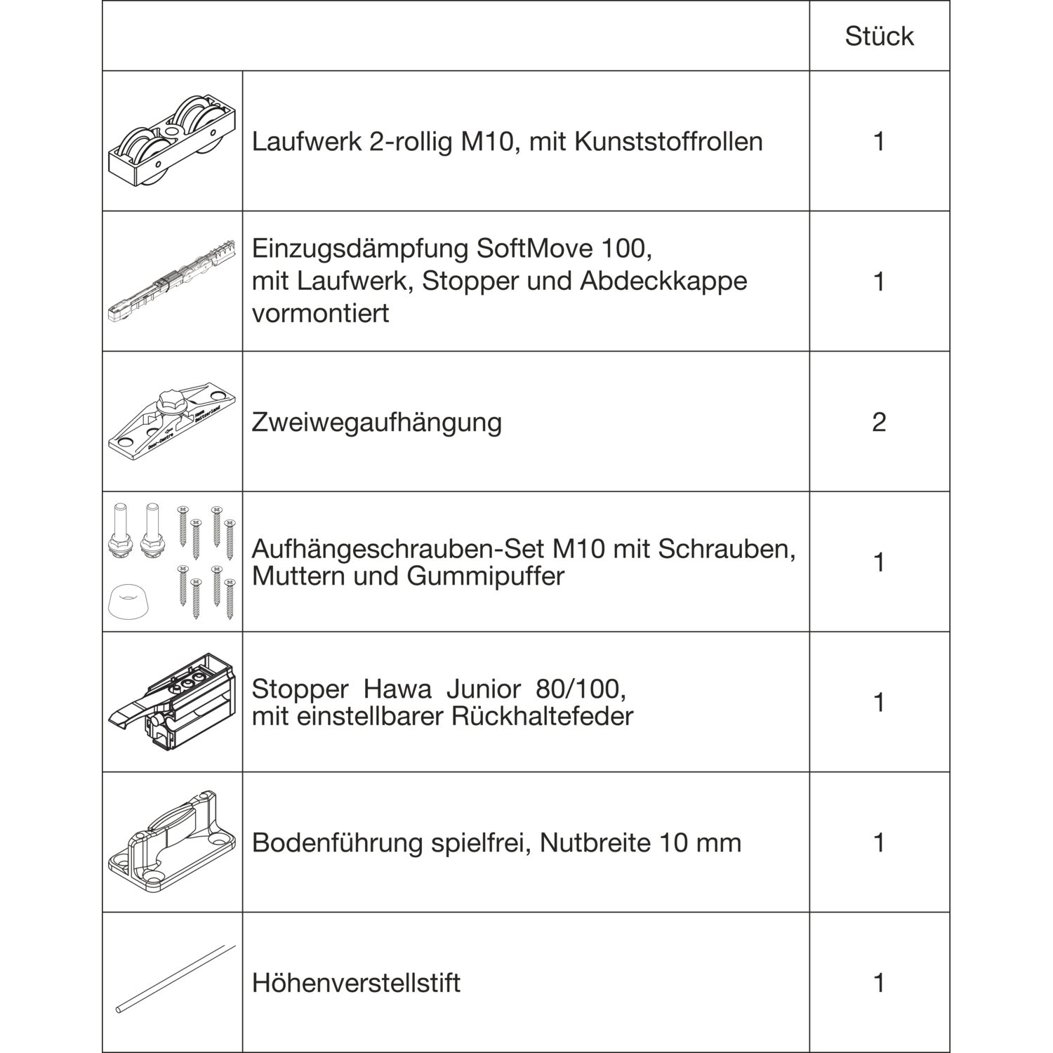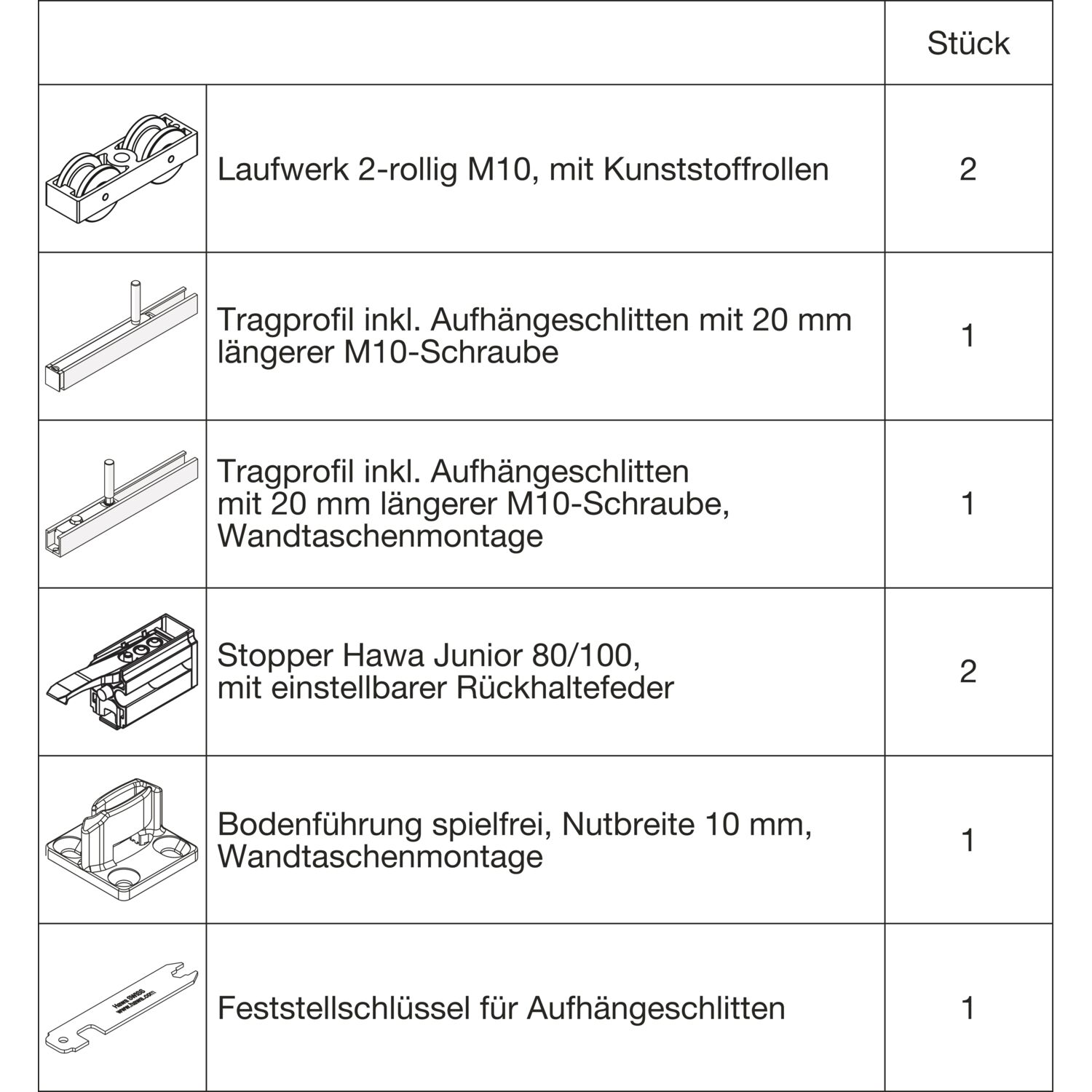 HAWA Junior 100/B Beschlagset Holz 2 Fangstopper Standard Tragschraube +20 mm