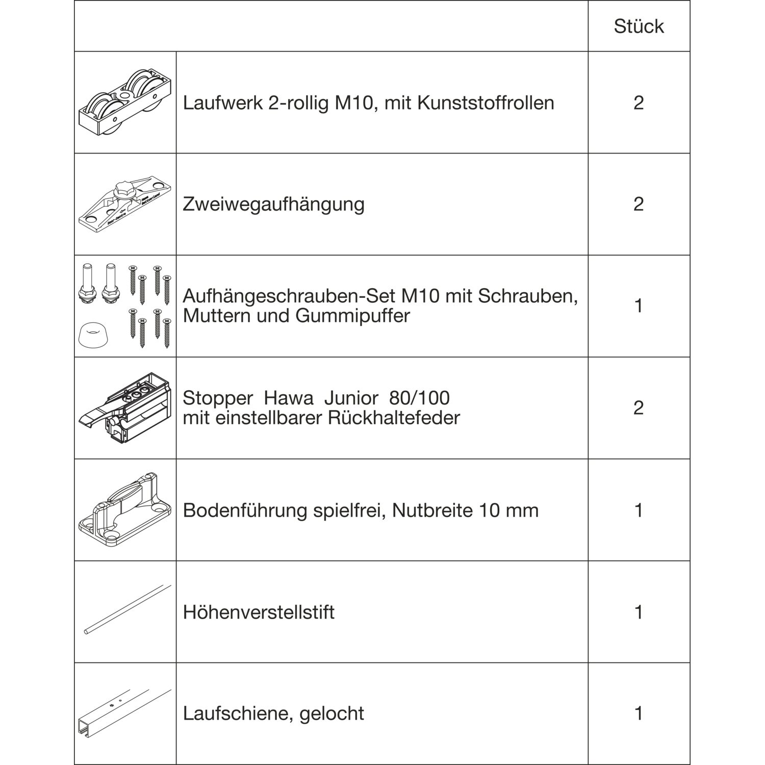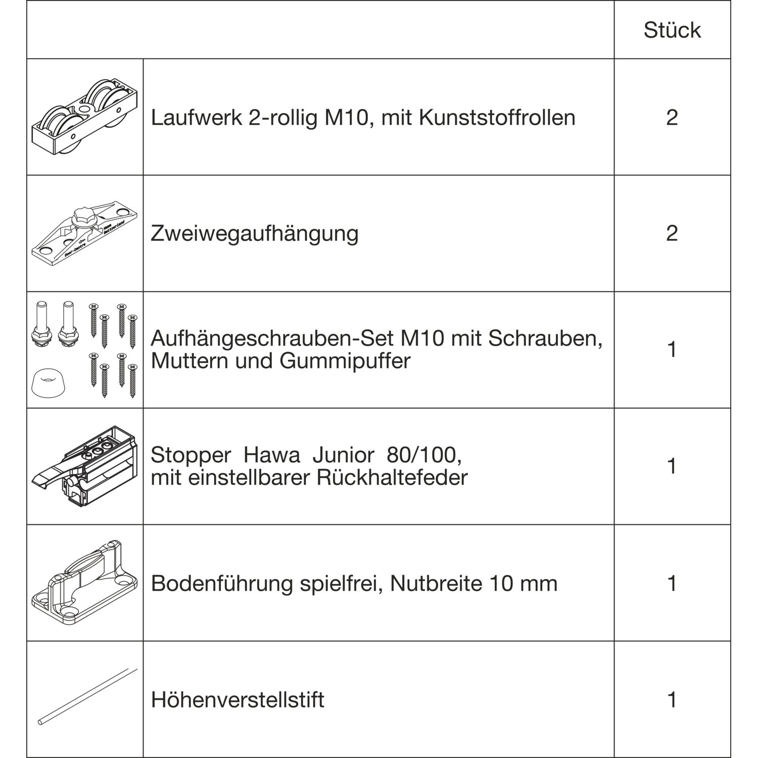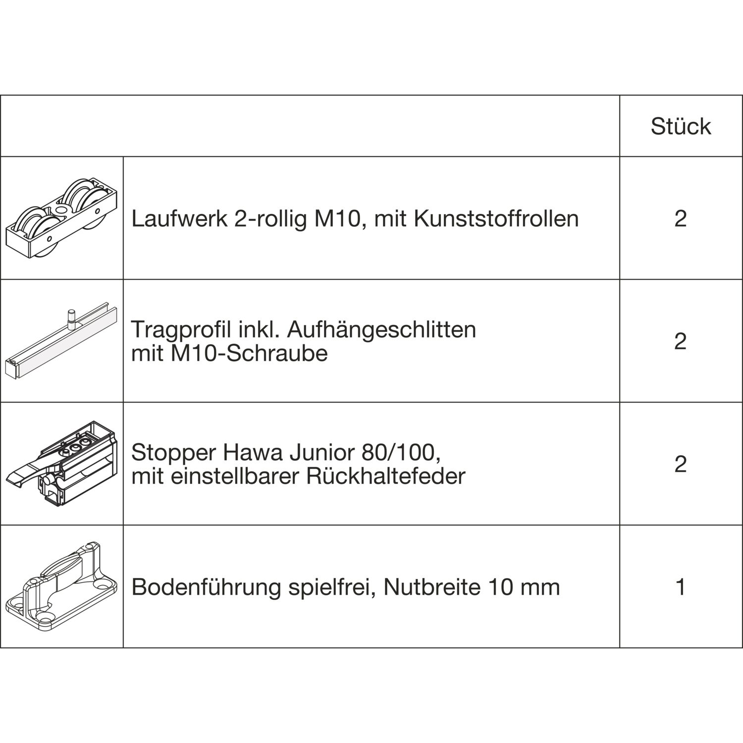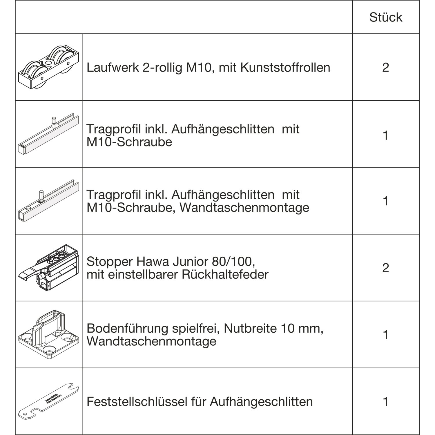 HAWA Junior 100/B Beschlagset Holz 2 Fangstopper Standard Tragschraube +20 mm