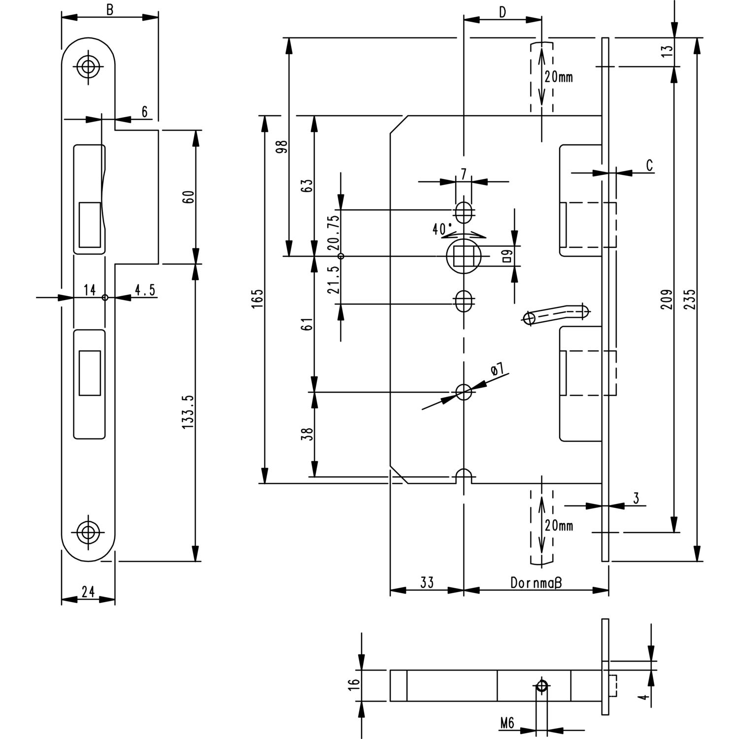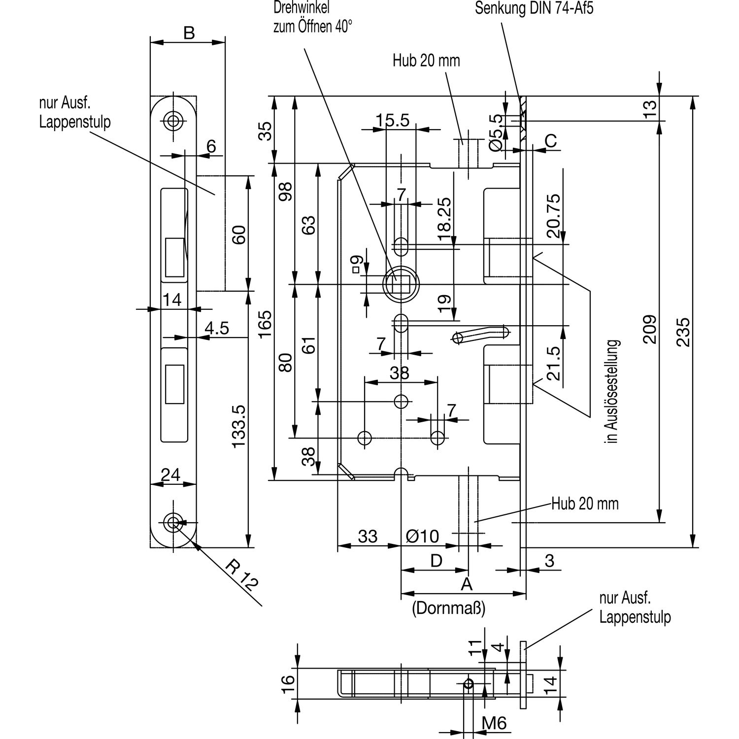 Fluchttürtreibriegel 2390, links, DM 65, Lappenstulp 235 x 36 mm, Edelstahl