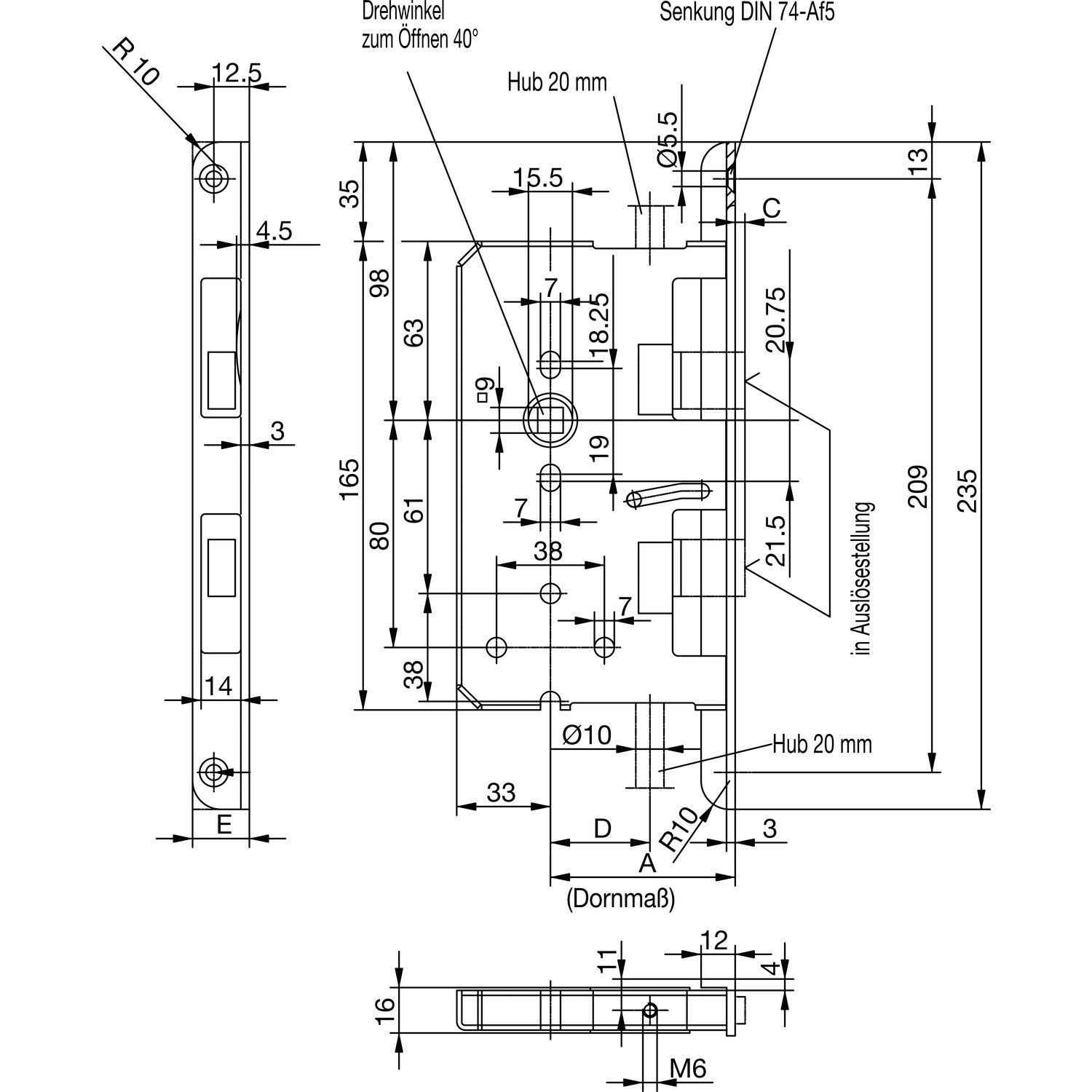 Türtreibriegel aufliegend Pfeil, schwer sperrbar, rechts, Hub 23 mm,silber elox.