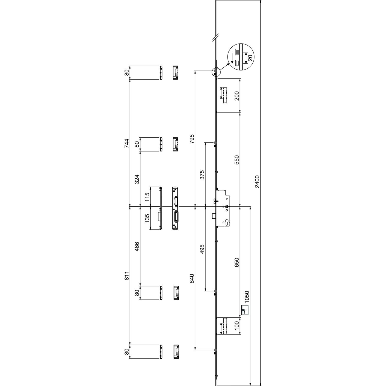 MACO MFV-Schloss Z-TS PT i.S, DM 80 mm,Stulp 2400 x 16 x 3 mm eckig,silberfärbig