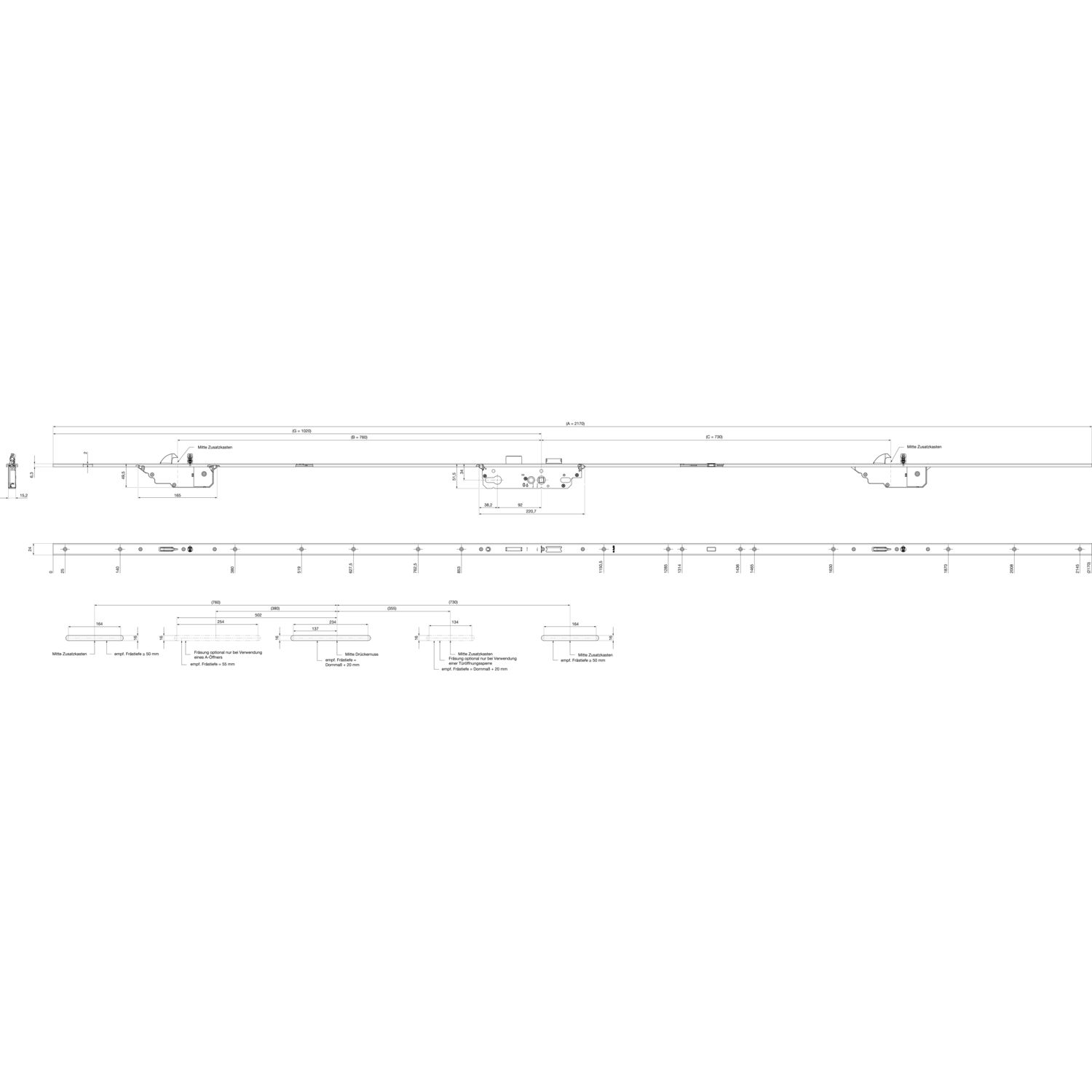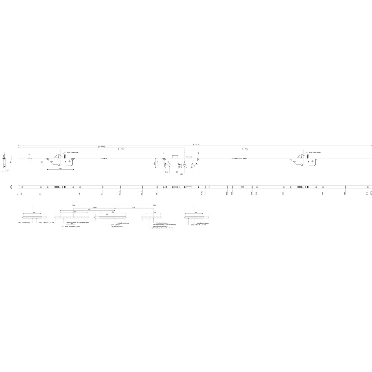 KFV MFV-Schloss AS 3600 DIN, DM 45,Stulp 2170 x 24 x 6,3 mm U-Stulp,verz. silber