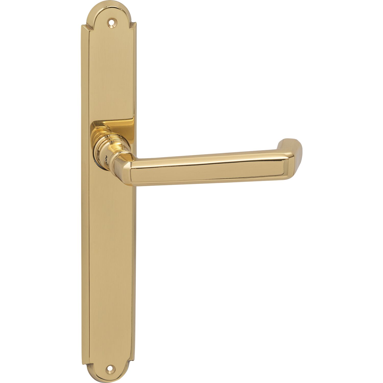 Feuerschutz Drückergarnitur Alt Wien auf Langschild, PZ72, Messing poliert