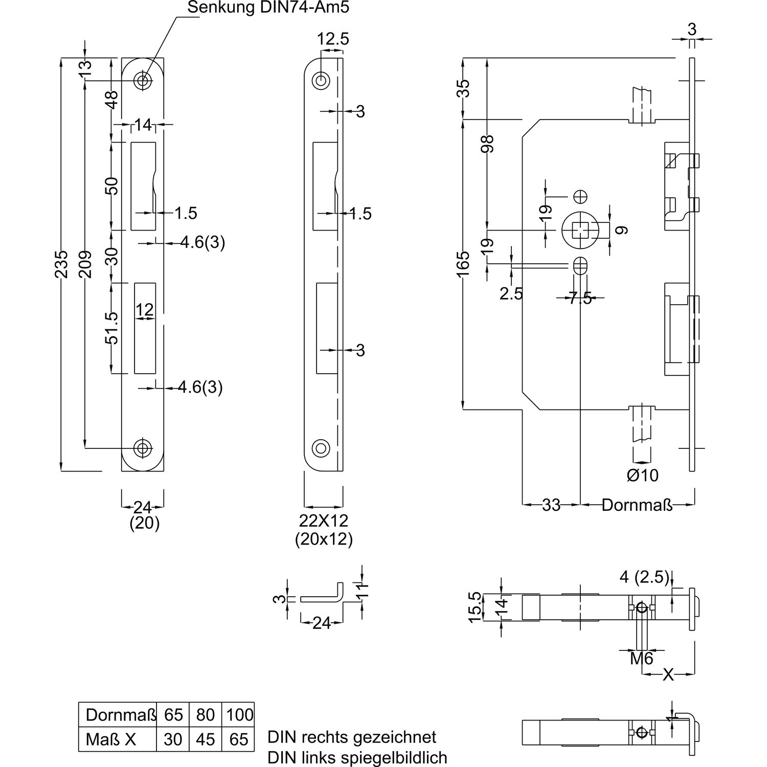 BKS Schaltschloss B1595, Stulp eckig, abgewinkelt 24/125/45 mm, DM 45, Edelstahl